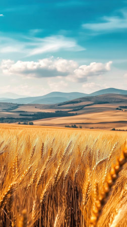 Golden stalks of wheat stand tall, gently swaying in the warm afternoon sunlight. The vast countryside stretches behind, highlighting nature's serene beauty and abundance.