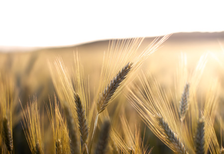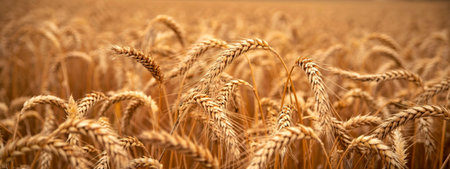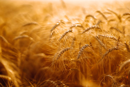 Golden wheat spikelets on the sunset. Ripe grain field on a sunny bright day. Agricultural, farm and nature concept