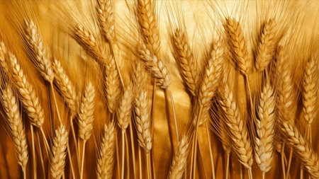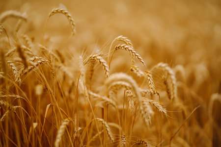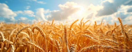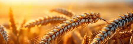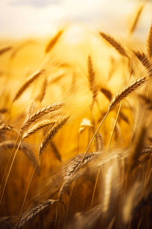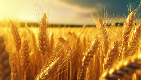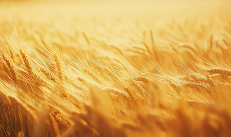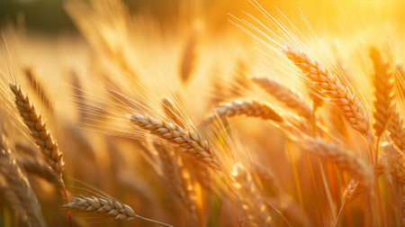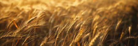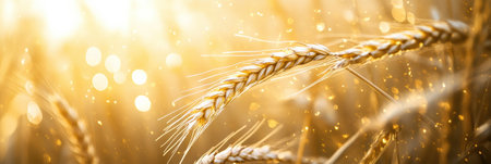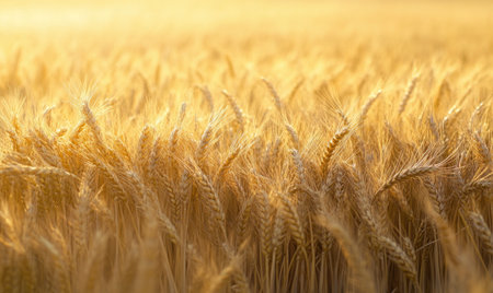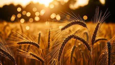 A detailed close-up shot focuses on the golden ears of wheat swaying gently in a sun-drenched field. The warm sunlight illuminates the fine strands of the wheat, creating a rich, textured appearance. The background is a soft blur of golden bokeh highlights, suggesting the vastness of the field and the radiant glow of the sun. evokes a sense of abundance, the beauty of nature's harvest, and the warmth of a summer day. It is themes related to agriculture, food production, or peaceful rural...