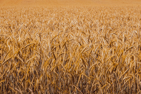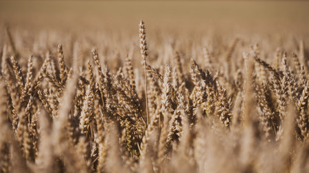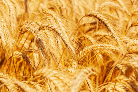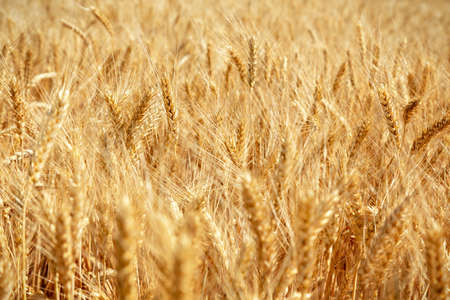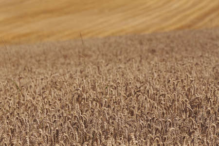 Ripe harvest ready wheat crops field in summer, cereal plant cultivation, selective focus