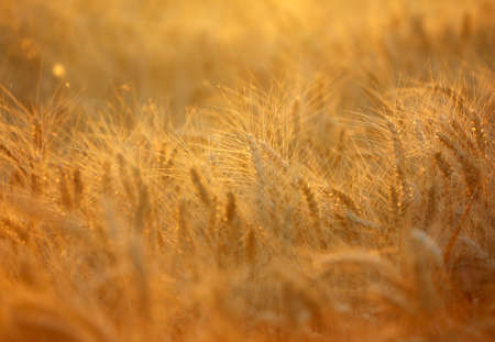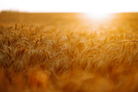 A close-up view of a wheat field bathed in the warm glow of a setting sun. The golden stalks are in sharp focus, with their ears of grain clearly visible. The background blurs into a soft, hazy expanse of more wheat, stretching towards the horizon. The warm, natural light creates a serene and peaceful atmosphere, highlighting the beauty of agricultural abundance and the promise of harvest.