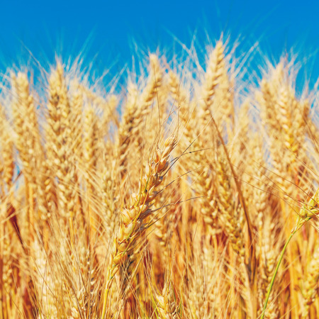 spikelets of wheat on a field on a farm against the backdrop of a clear blue sky