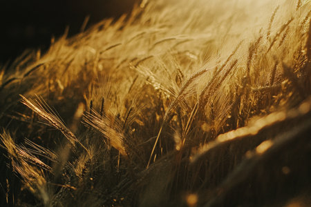 A detailed macro shot of golden wheat stalks swaying gently in a field. The warm, soft light of sunset or sunrise illuminates the grains, creating a golden hue and highlighting the delicate textures of the wheat ears and their fine awnings. The background is softly blurred with a bokeh effect, emphasizing the foreground and creating a serene, peaceful atmosphere. The evokes a sense of natural abundance and the beauty of agricultural landscapes.
