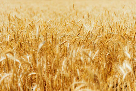 field with yellow ripe wheat on a summer day. Good harvest, close up