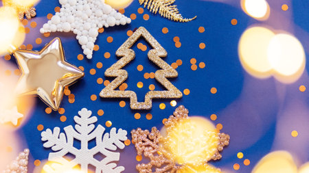 Banner with golden and white decorations for Christmas tree. New Year decorative stars and snowflakes on classic blue background.