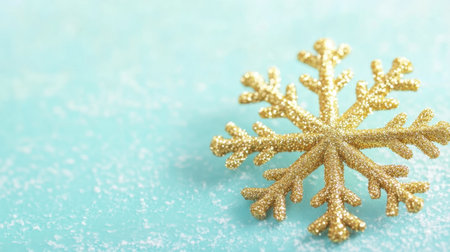 A stunning golden glitter snowflake rests on a light blue background, perfect for holiday and winter-themed decorations, evoking warmth and joy.