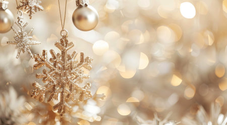 Golden snowflake ornaments hanging against a dreamy Christmas background, adorned with soft bokeh lights creating a warm, festive atmosphere. The blurred backdrop enhances the sparkle and magic scene.