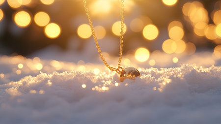 A stunning gold necklace rests gracefully on soft white snow, illuminated by warm sunlight. The background features exquisite bokeh, creating a dreamy winter scene.
