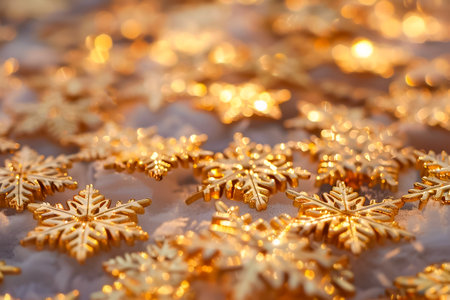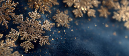 Gold snowflake shapes gently scattered over dark background with luxurious Christmas atmosphere