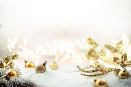 Christmas gold decorations on snow with fir tree branches and christmas lights. Winter Decoration Background