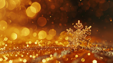 A glittering golden snowflake on a shimmering, bokeh-lit golden backdrop, conveying holiday warmth.