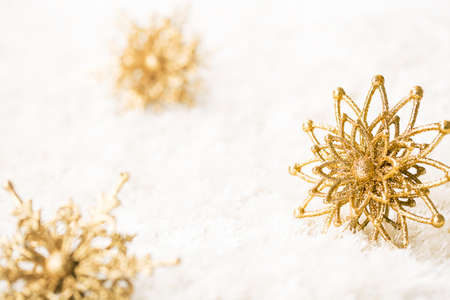 Golden and silver snowflakes on snow, closeup. Christmas background