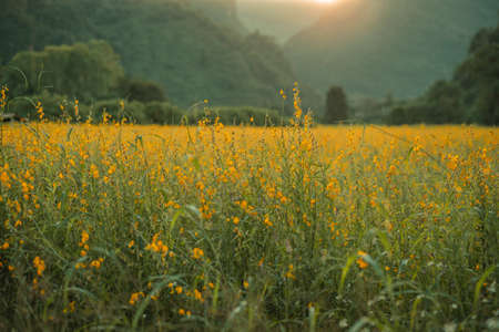 Sunhemp flowers in the field. Blurred and soft focus of Sunhemp field with copy space and text.
