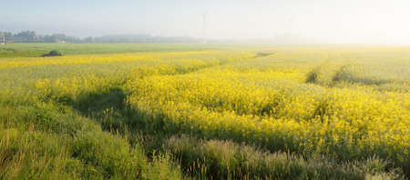 Wind turbine generators on a blooming yellow rapeseed field. Morning fog. Idyllic summer rural scene. Nature, ecology, ecological issues, alternative renewable energy, production, farm industry