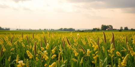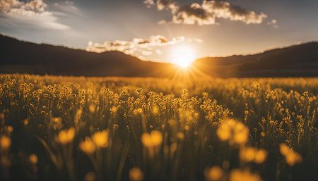 Golden yellow flowers stand tall in a field as the sun rises casting warm light over the landscape. The scene captures the beauty of nature in the early morning.