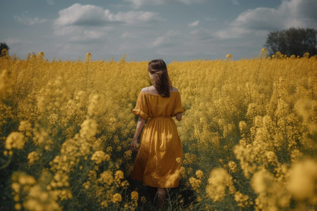 A girl in a yellow dress in a field of yellow flowers. A young girl full rear view walks in a field of mustard flowers, AI Generated