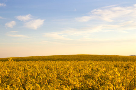Agricultural rapeseed field at flowering sunset or sunrise. Rural landscape.