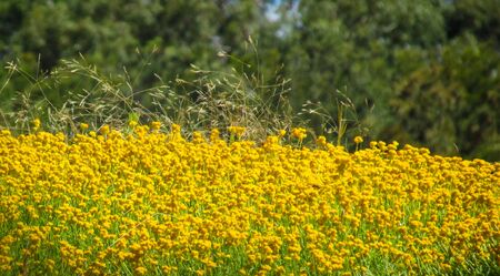 Beautiful yellow flowers on a bokeh background. Yellow summer meadow flowers