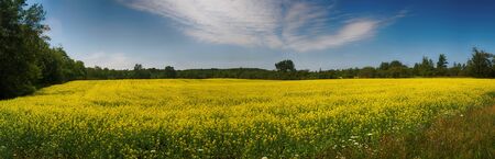 Panoramic view of blooming yellow rapeseed field under blue sky during the summer in Collingwood, Ontario