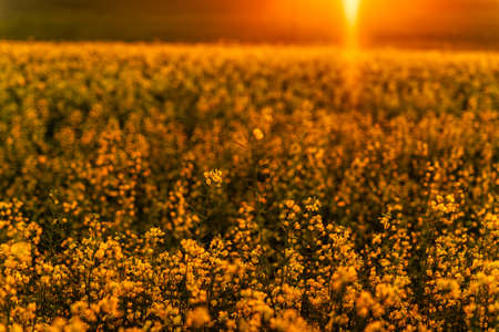 Blooming rapeseed field with sunset light. Yellow flowers