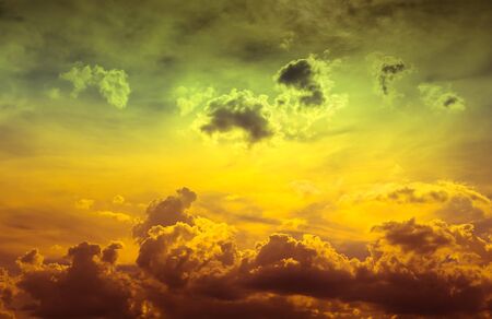 wonder hell sky,dark red and orange color light on clouds in yellow and green neon light sky