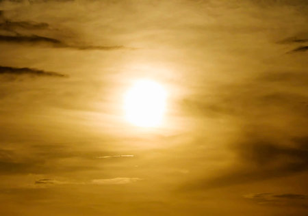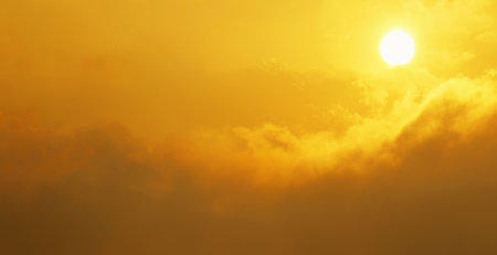 Brilliant yellow sunset and sunrise beautiful over white clouds with bright yellow sun on a cool spring morning.