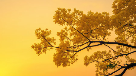 A stunning image showcasing a branch of vibrant yellow flowers against a soft golden sunset sky, evoking feelings of tranquility and beauty in nature.