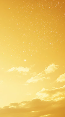 Yellow sky with scattered clouds and stars, serene evening ambiance. Dreamy sky and tranquility concept