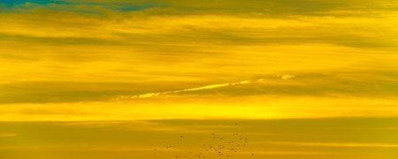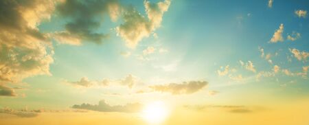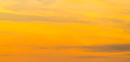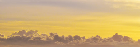 Yellow sky with cloud. Panoramic morning sunrise sky background. Summer Autumn sunset. Beautiful nature landscape. Cumulus cloudscape.