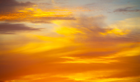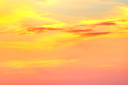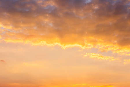 Nature background of twilight sky with orange cirrus clouds at golden hour
