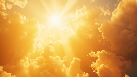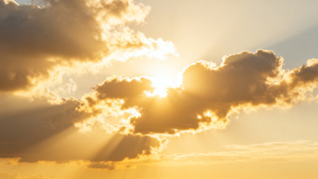 Bright sunlight breaking through golden clouds, casting warm, glowing rays across a vibrant sky for a heavenly, uplifting atmosphere.