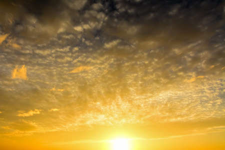 Sunset sky background with tiny clouds. Beautiful nature scene with sunbeams.