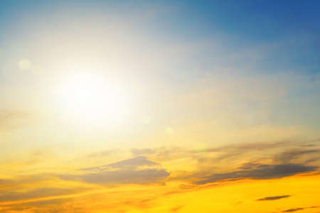 Blue sky clouds background. Beautiful landscape with clouds and orange sun on sky