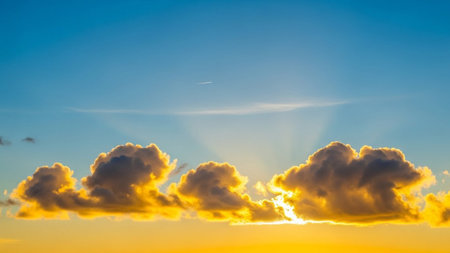 Textures showing golden sunset illuminates fluffy cumulus clouds with dramatic sunbeams piercing the bright blue sky...