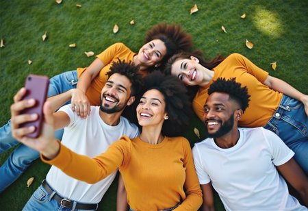 ?rendy group of multiracial young people women and men friends taking selfies pictures, lying on a green trimmed lawn. The main character holds the phone, while others smile and fool around.