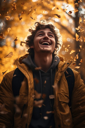 Autumn's Dance: A Teenager Delights in Catching Falling Leaves amid the Splendor of a Park Painted with Autumn Hues. Generative AI