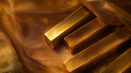 A close view of luxurious gold bars resting on rich satin fabric, capturing their shine and luster while emphasizing elegance and investment potential.