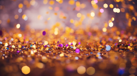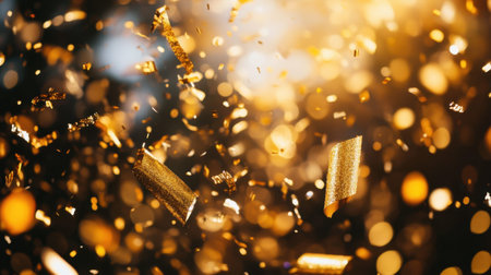 Captivating scene of golden confetti falling gracefully through the air, creating a festive atmosphere filled with bright bokeh lights and sparkling joy.