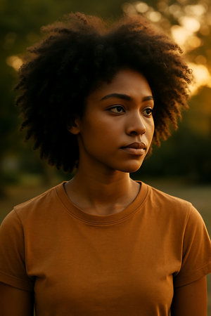 Candid portrait of a young woman captured in warm evening light outdoors.