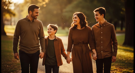 A happy family of four walking together in a park at sunset