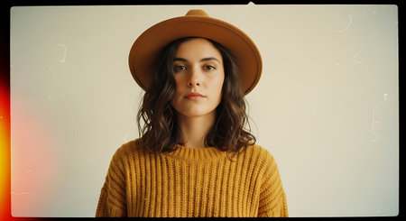 A young woman wearing a brown hat and sweater posing in front of a white background