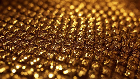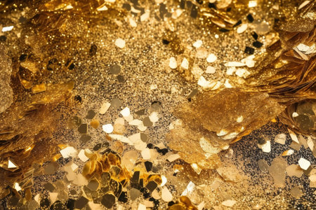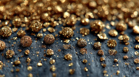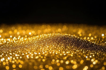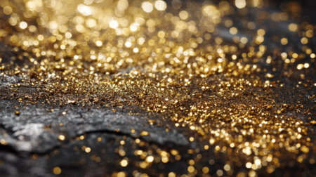 Golden sparkles cover a dark surface reflecting light and creating an enchanting display.