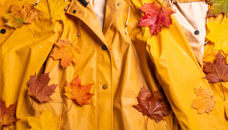 Two mustard-yellow raincoats adorned with vibrant autumn maple leaves, showcasing a fall fashion concept. Water droplets are visible on the coats and leaves