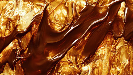 This abstract image showcases a golden brown texture with flowing liquid patterns that create a captivating and dynamic visual experience. The glossy surface enhances the richness of the colors, making it ideal for various creative projects.