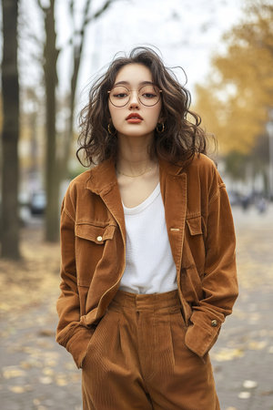Stylish Young Woman in Trendy Brown Jacket and Pants