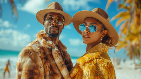 A young stylish couple in fur coats on a tropical beach. The concept of recreation and tourism.