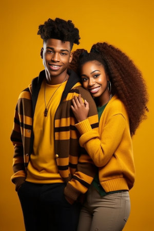 Beautiful young African couple looking at camera and smiling against yellow background : Generative AI