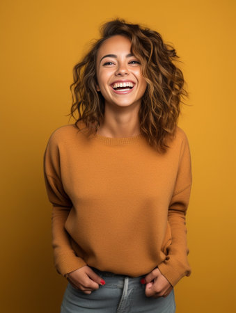 Excited african american female model smiling happily on yellow background. AI Generated