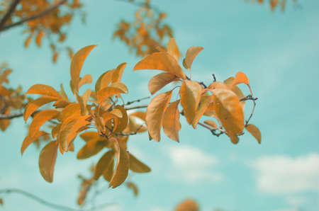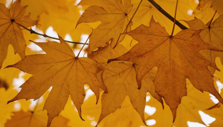 Yellow maple leaves on a tree branch in autumn, close-up