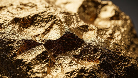 This extreme close-up reveals the intricate texture of a golden metallic surface. The appears rough and uneven, with deep, organic crevices and crater-like indentations that create dramatic interplay of light and shadow. The surface is highly reflective, casting a warm, opulent glow. The texture suggests a molten or geological formation, evoking a sense of richness, luxury, and raw, precious The abstract pattern and intense detail make it a visually striking and complex background.